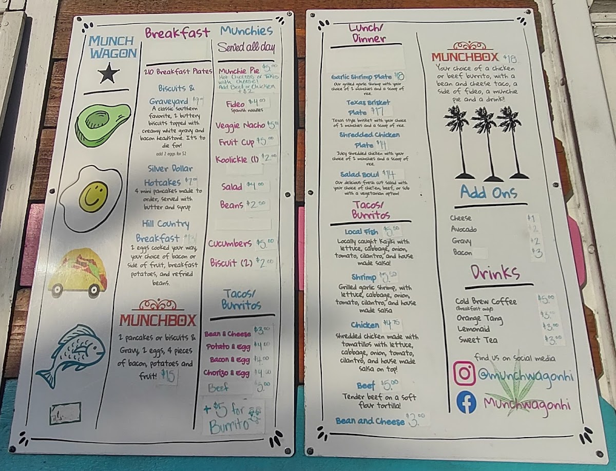 The menu features a variety of breakfast and brunch options, organized to accommodate different tastes and preferences. Food selections include hearty breakfast burritos, various types of French toast and pancakes enhanced with local ingredients such as lilikoi and fresh pineapple, as well as savory items like jackfruit and pulled pork tacos. Light bites and bakery items are available, including grilled banana bread and croissant-based dishes.
